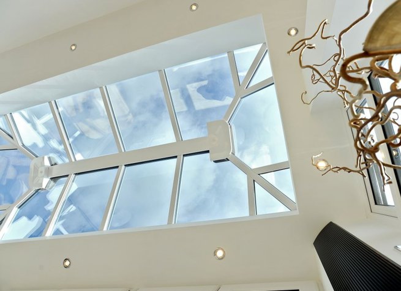 The LivinRoom Orangery uses the well proven Ultraframe Classic roof at its heart, and a well engineered internal framework is added, then plastered, to give a perimeter ceiling all the way round.